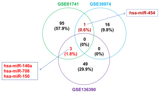 Venn diagram of the intersection of three miRNA microarray expression data sets (GSE61741, GSE38974, and GSE136390).