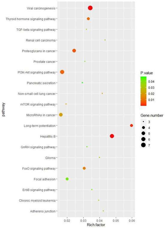 Gene function enrichment analysis was performed on the target genes regulated by miRNAs in the regulatory network from the DAVID database. The enrichment items of biological processes mainly included the negative regulation of substrate adhesion-dependent cell spreading and the regulation of sequence-specific DNA binding transcription factor activity (Figure 8); the enrichment items of cell components mainly included lipid particles and cytoplasm (Figure 9); and the enrichment items of molecular function mainly included transcription factor activity, sequence specific DNA binding, and GTPase activity (Figure 10). KEGG pathway analysis showed that the first five enrichment items were long-term potentiation, hepatitis B, renal cell carcinoma, adherens junction, and non-small cell lung cancer (Figure 11).