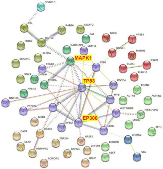 The online tool STRING (https://string-db.org/, accessed on 20 December 2022) was used for protein interaction analysis of predicted target genes, and a protein–protein interaction (PPI) network was constructed to obtain the key nodes [16].