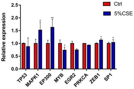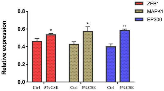 Compared with the control group, exposure to 5% CSE working solution could lead to significant changes in the mRNA expression levels of the selected key molecules. Specifically, ZEB1, MAPK1, and SP1 expression levels were significantly increased (p < 0.05); EP300 level was extremely significantly increased (p < 0.01); while MYB level was significantly decreased (p < 0.05) (Figure 13).