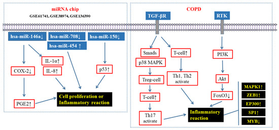 Sato et al. found that the expression of miR-146a decreased in the lung fibroblasts of COPD patients. Further studies showed that, after the deletion of miR-146a, the expression level of COX-2, the target gene regulated by the miRNA, was down-regulated, and then the expression level of prostaglandin E2 (PGE2) was up-regulated [25,26,27]. Osei et al. co-cultured human bronchial epithelial cells with primary human lung fibroblasts (from a control population and COPD patients) and then detected the expression of miR-146a-5p. The results showed that the expression level of miR-146a-5p decreased significantly in fibroblasts of COPD patients, and that miR-146a-5p was involved in the functional regulation of lung fibroblasts and negatively regulated epithelia-derived IL-1α induction of IL-8 in fibroblasts. Combined with these results, the authors speculated that the expression level of miR-146a-5p in lung fibroblasts was closely related to the inflammatory phenotype of COPD patients [28]. Keller et al. investigated the whole genome miRNA expression profile of whole blood samples from patients with COPD and carried out survival correlation analysis of the subjects. The results showed that, among a large number of candidate markers, miR-150-5p was differentially expressed between surviving and non-surviving patients. Further analysis showed that miR-150-5p could regulate proliferation-related genes (such as p53) [29,30]. The research of Liu et al. showed that the expression level of miR-708-3p was decreased during pulmonary fibrosis and was negatively correlated with idiopathic pulmonary fibrosis (IPF) [31]. Zhu et al. confirmed that miR-454 overexpression was an adverse prognostic factor in patients with non-small cell lung cancer. The down-regulation of miR-454 significantly reduced proliferation, enhanced apoptosis, and inhibited the invasion and migration of non-small cell lung cancer cells [32]. Taken together, the above four miRNAs are closely related to the pathological process of COPD.