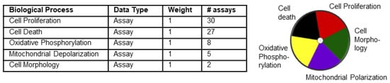 The ToxPI GUI was downloaded at http://comptox.unc.edu/toxpi.php (accessed on 20 September 2017) and saved as a Java application on the desktop. Data exported from the Toxicity Forecaster were reformatted in an Excel sheet and inserted into the ToxPI program. The ToxPI GUI was opened, and the reformatted Excel sheet was uploaded by the “insert” icon. In total, seventeen chemicals were chosen manually, and the “generate charts” icon was selected, which allowed each of the biological processes to be sorted. The data were sorted by the assays option, and each assay option was named for each biological process. For each assay option, a corresponding data selection icon appeared, and data for each biological process were selected manually. Each biological process was given a uniquely colored pie slice (Figure 1): cell morphology, 2 assays; mitochondrial depolarization, 5 assays; oxidative phosphorylation, 8 assays; cell death, 27 assays; and cell proliferation, 30 assays. These 5 pie slices were scaled by selecting −log10(x) + log10(max(x)) on the drop-down menu; this ensured that lower active AC50 values were given separation from non-active hits. Pie charts were generated by selecting the final generation tab.