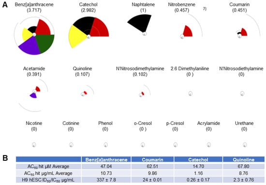 ToxPI results for 17 HPHCs. (A) Pie charts for 17 of the chemicals on the HPHC list. Refer to Figure 1 for color coding of ToxPI pie slices. (B) ToxPI charts. Benz[a]anthracene (3.717) through N-nitrosodimethylamine (0.102) had designated “hits” and produced positive ToxPi values (0 < X). The remainder of the chemicals, including nicotine, had ToxPI-predicted null effects (X = 0). (B) Toxicity Forecast data averages and in vitro H9 hESC ID50/IC50 µg/mL values obtained from concentration–response curves. The average assay hit value in µM (AC50) for each of the tested ToxPI positive constituents was obtained from the Toxicity Forecaster database. The AC50 in µM for was then converted into µg/mL for appropriate cross-comparison to the H9 hESC ID50/IC50 values calculated from the in vitro osteogenic screen (see page 8).