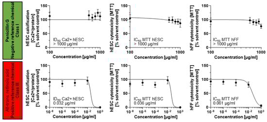 Half-maximal inhibitory concentrations for cell viability (IC50 hESC) and differentiation (ID50 Ca2+ hESC) were established for penicillin G and all-trans retinoic acid from concentration–response curves. The hESTo then compares these two endpoints to the half-maximal inhibitory concentration for cell viability resulting from exposure of fibroblast cells to the same test compound (IC50 MTT hFF) (Figure 3).