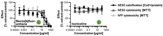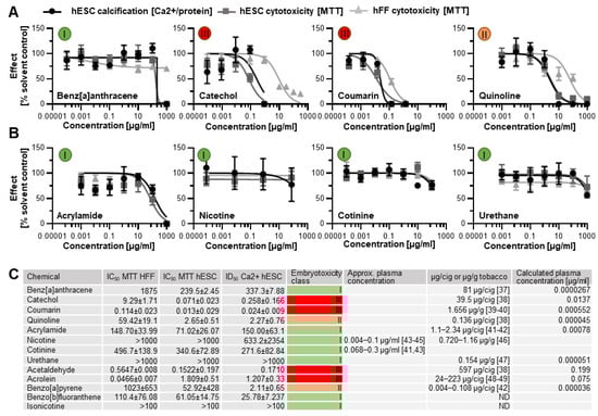 Concentration–response curves. (A) Three ToxPI positive constituents elicited an effect on cytotoxicity and osteogenic differentiation. (B) All of the ToxPI null chemicals caused inhibition at relatively high concentrations. (C) Table listing IC50 and ID50 values, calculated via GraphPad Prism and expressed as µg/mL, embryotoxicity classes calculated according to Genschow et al. [], and content per cigarette (cig) or gram tobacco as well as actual and calculated plasma concentrations assuming a plasma volume of 3000 mL. Embryotoxicity classes are given in colored circles. ID50 = half-maximal inhibitory concentration of differentiation. IC50 = half-maximal concentration of cytotoxicity. hESC, human embryonic stem cell; hFF, human foreskin fibroblast; ND, not determined from the literature [,,,,,,,,,,,,].