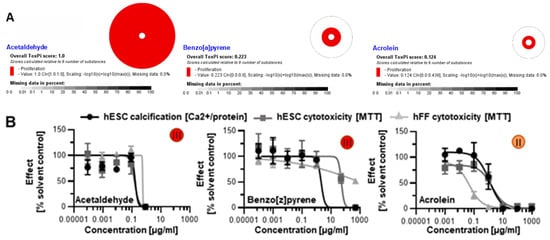 In addition to the 17 chemicals we identified from the HPHC list using ToxPI, we also selected five more based on existing developmental and skeletal toxicity data: acetaldehyde [,], benzo[a]pyrene [,], acrolein, benzo[b]fluoranthene [], and isonicotine. The first three were existent in the database, though with incomplete assays. Using AC50 concentrations from the available proliferation assays generated positive ToxPI charts (Figure 5A).