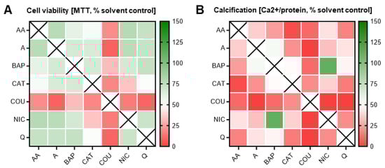 Double combination heatmaps. MTT (A) and calcium (B) assays corresponding to double combinatorial exposures. In most combinations, cell survival was maintained at or above 100%; however, differentiation was inhibited in almost all combinations. Heatmaps were generated via GraphPad Prism. Data were normalized to solvent control (0.1% DMSO). AA, acetaldehyde; BAP, benzo[a]pyrene; CAT, catechol; COU, coumarin; NIC, nicotine; Q, quinoline; A, acrolein.