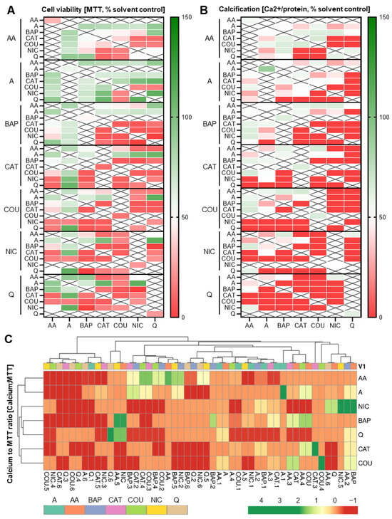 Heatmaps pertaining to triple exposure combinations. (A,B) Triple combination heatmaps. MTT (A) and calcium (B) assays corresponding to triple combinatorial exposures. Heatmaps were generated via GraphPad Prism. In most combinations, the addition of acrolein (in comparison to double combinations) maintained cell survival at or above 100%. Data were normalized to solvent control (0.1% DMSO). (C) Calcium content was set in relation to MTT results and a clustered heatmap was generated from the resulting ratios using ClustVis []. AA, acetaldehyde; BAP, benzo[a]pyrene; CAT, catechol; COU, coumarin; NIC, nicotine; Q, quinoline; A, acrolein.