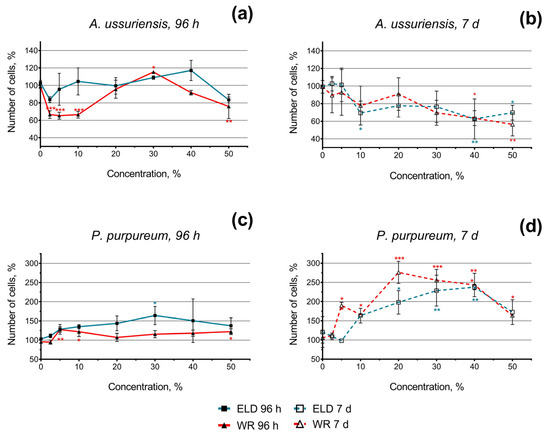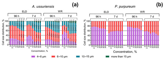 The changes in the size of microalgae cells after 96 h and 7 days of exposure are represented in Figure 4. In general, the results demonstrate significant concentration- and time-dependent increases in the size of the cells of A. ussuriensis. P. purpureum demonstrated significant but not dramatic increases in cell size only after 96 h of exposure to sample WR at the highest used concentration, and this effect was not registered after 7 days of exposure (Figure 4b).