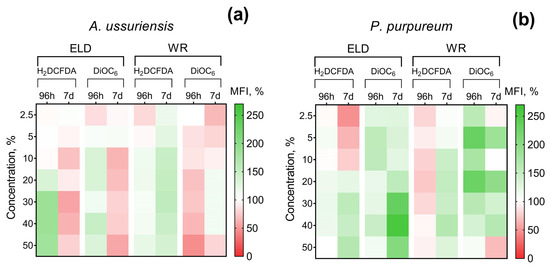 Effect of underwater welding on ROS generation and membrane potential of microalgae after 96 h and 7 days of exposure: (a) Changes observed for microalgae A. ussuriensis; (b) Changes observed for microalgae P. purpureum. ELD, suspension obtained after using an arc welding electrode; WR, suspension obtained after using a flux-cored wire; H2DCFDA, 2′,7′-dichlorodihydrofluorescein diacetate (ROS generation indicator); DiOC6, 3,3-dihexyloxacarbocyanine iodide (membrane potential indicator). All the white sections represent nonsignificant results (p > 0.05).