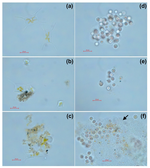Microscopic pictures of microalgae after 7 days of exposure to welding suspensions at concentration 50%: (a) Control group of A. ussuriensis without the exposure; (b) A. ussuriensis exposed to sample ELD; (c) A. ussuriensis exposed to sample WR; (d) Control group of P. purpureum without the exposure; (e) P. purpureum exposed to sample ELD; (f) P. purpureum exposed to sample WR. ELD, suspension obtained after using an arc welding electrode; WR, suspension obtained after using a flux-cored wire. Black arrow indicates the exopolysaccharide coverage, excreted by P. purpureum cells. Scale bar = 10 µm.