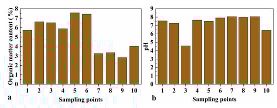 Physical and chemical properties of soil samples. (a) Organic matter content of sampling points. (b) pH of sampling points. (sampling points: (1, 3, 5, 6) pak choi, (2) rice; (4) spring onion; (7, 10) radish; (8) Chinese cabbage; (9) Chrysanthemum coronarium).