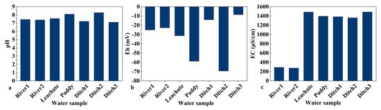 Physical and chemical properties of water samples: (a) pH; (b) redox potential Eh; (c) electrical conductivity EC.