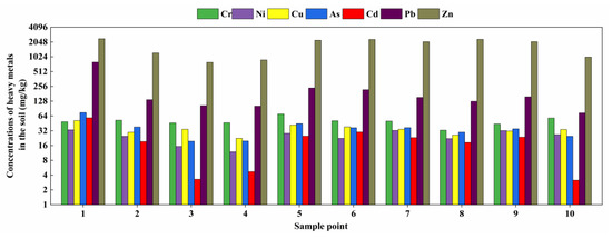 Heavy metal contents in farmlands. Sampling points are the same as in Figure 2.