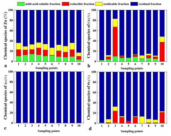 Chemical proportions of four characteristic heavy metals. Chemical species of: (a) Zn; (b) Cd; (c) As; (d) Pb. Sampling points are the same as in Figure 2.