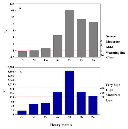 Nemeiro comprehensive pollution assessment and potential ecological risk assessment of soils. (a) PN of heavy metals; and (b) RI of heavy metals.