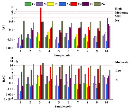 (a) Ratio of secondary phase to primary phase (RSP); and (b) risk assessment coding (RAC) evaluation results of soil samples.