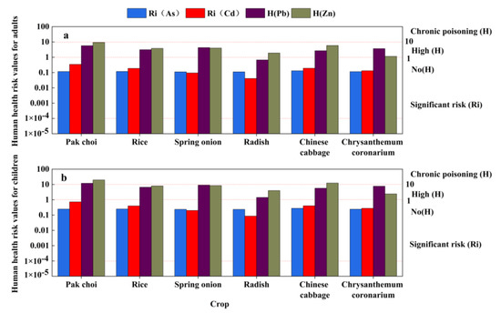 Heavy metals in the soil can be absorbed by crop plants through the roots and accumulate in different organs and tissues. If the edible parts accumulate large amounts of heavy metals, they can cause serious human health effects via the food chain [59]. The risks of carcinogenic chemicals (Cd, As) and non-carcinogenic chemicals (Pb, Zn) in six crops to the health of adults and children are shown in Figure 8. The results show that the risks of As and Cd in the six crops were higher than the maximum acceptable risk level of 1 × 10−4 for both adults and children, which indicated that the accumulated As and Cd posed serious health risks. The intake of Pb through pak choi by children exceeded the maximum acceptable risk level and posed a risk of chronic toxicity. The risks of Pb to both adults and children were lower than 10 (except for the intake of radish by adults, which presented a low risk), but the possibility of negative effects was high. The health risks of Zn in pak choi and Chinese cabbage for children were above the maximum acceptable risk levels, and Zn in the other crops (below 10 for adults and children) presented a high possibility of health risks for children and adults.