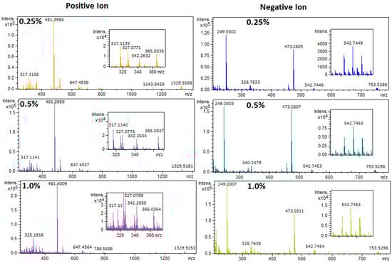 AP-MALDI-qTOF-MS full-scan mass spectra of a standard mixture (Table S1) measured on three different GNP-doped UP AP-MALDI target plates. Top; 0.25 wt.% GNP, middle; 0.5 wt.% GNP, and bottom; 1.0 wt.% GNP. Left: positive ionization mode. Right: negative ionization mode.