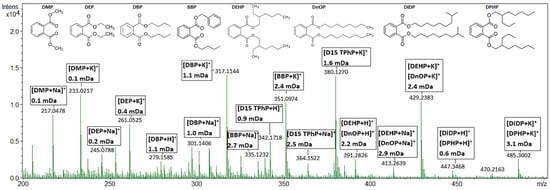 All additives previously quantified [,] in the plastic consumer products using GC-MS and LC-MS/MS were confirmed with the AP-MALDI using the optimized UP GNP-doped target plate, except for TCP in the Christmas ornament and BDE209 (Table 1). The TCP level in the Christmas ornament was 50 mg L−1, which is too low for the detection with the AP-MALDI-qTOF-MS method. Further research is needed to investigate why BDE209 could not be detected using AP-MALDI-qTOF-MS. No false-positive detections were found. The additives present in the sub-ppm range could be easily detected with the AP-MALDI. For example, TPhP was detected at 40 mg L−1 (0.004 wt.%) in sample two, in both positive and negative ionization mode, tris(2-chloroethyl) phosphate TCEP with a concentration of 1000 mg L−1 (0.1 wt.%) in sample six, and 2,4,6-TBP and TBBPA were detected in samples two, four, and six at levels of 3000 mg L−1 (0.3 wt.%). BDP and TBPP-TAZ quantified in samples two and 12 were also confirmed with AP-MALDI. Samples thee, four, six, and eight were not previously quantified for RDP and BDP; however, with the AP-MALDI, RDP was detected in all of these samples and BDP in three of them. A positive full scan mass spectrum of the PVC-CRM is shown in Figure 2 and concentrations of 1000 mg L−1 (0.1 wt.%) for DBP, BBP, and DEP could easily be detected. DEHP and DNOP were also detectable in the PVC CRM, but we were unable to separate them based on a similar molecular formula. DMP did not meet the set screening criteria and was present as an impurity in the UP GNP-doped target plate. Labeled D15-TPhP (125 mg L−1) was added to the extract as a control standard.