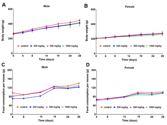 Figure 1. Mean body weights (g) of male (A) and female (B) rats and food consumption per mouse (g) of male (C) and female (D) rats orally exposed to 0, 250, 500, and 1000 mg/kg b.w./day curcumol for 28 days.