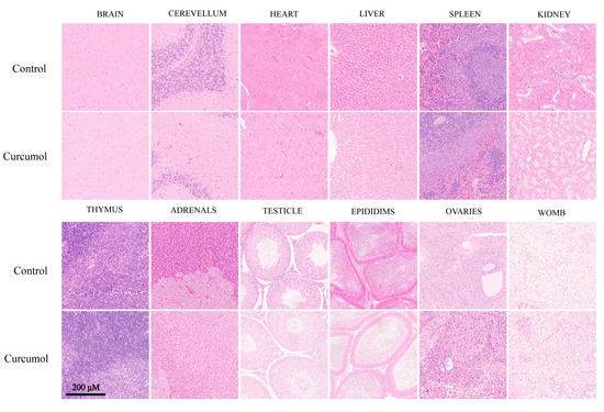 Figure 2. H&E stained sections of brain, cerebellum, heart, liver, spleen, kidney, thymus, adrenals, testicle, epididims, ovaries, and womb from SD rats treated with control and curcumol (1000 mg/kg/day) for 28 days (scale bar: 200 μm).
