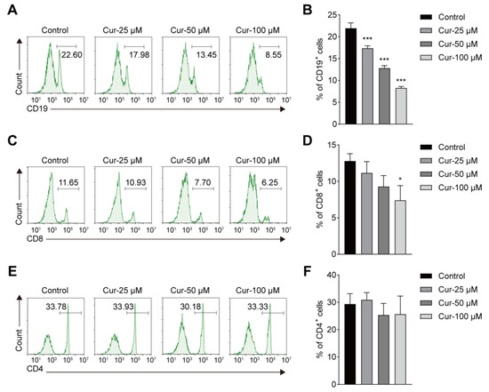 Figure 3. Effects of curcumol on CD19+, CD8+ and CD4+ immune cells in vitro. (A,C,E) Flow cytometry analysis of CD19+, CD8+ and CD4+ cells at different dose of curcumol concentrations. (B,D,F) Percentages of CD19+, CD8+ and CD4+ cells in peripheral blood mononuclear cells (PBMCs). The data represent the mean ± SD. * p < 0.05; *** p < 0.001.