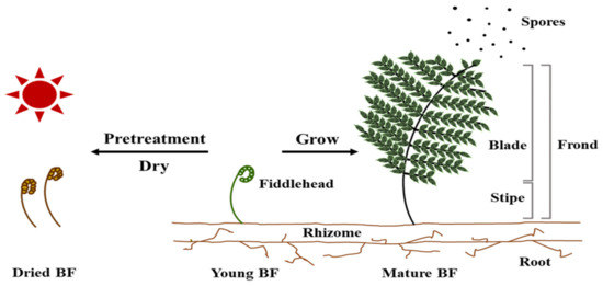 Ferns are a group of plants of considerable interest [1], which are less studied than vascular plants for several scientific aspects, such as their taxonomy [2], ecology, habitat, and vegetation [3]. Bracken fern (BF; Pteridium aquilinum) is a terrestrial plant with a wide variety of species distributed worldwide [4]. The plants’ structure is divided into roots, rhizomes, and fronds, and immature plants have fiddleheads on the fronds [5] (Figure 1). The fiddlehead gradually spreads out as the BF grows, and after it matures, it spawns and spreads the spores necessary for reproduction [5] (Figure 1). BF is often consumed in conditions of food scarcity by livestock grazing in large areas [6,7], and is an indicator of the pasture presence. By contrast, BF is frequently consumed in stir-fries, soups, and stews in East Asian countries, including Korea, Japan, and China [8,9]. In particular, in Korea, young BF is generally stored after pretreatment and sun-drying, and is then consumed after processing, according to various recipes (Figure 1).