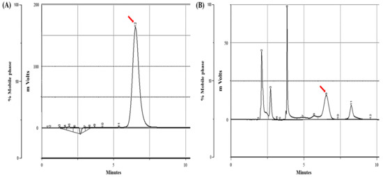 High-performance liquid chromatography (HPLC) chromatograms of PTA. (A) PTA (200 μg/mL) standard sample (arrow) and (B) BF sample (arrow).