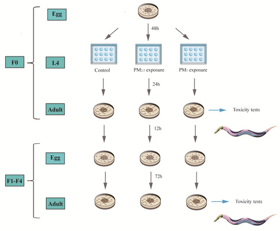 The PM was suspended and diluted using K-medium. The following 5 concentration gradients were set up: 0 (control), 1 mg/L, 10 mg/L, 100 mg/L, 1000 mg/L. Acute maternal exposure was used to investigate the effects of particulate matter on the health of offspring. Figure 1 shows the acute exposure experiment of C. elegans during the experiment. We selected gravid nematodes, rinsed them from the plates into centrifuge tubes and lysed for 2–3 min by adding K-medium and Clorox solution successively at 1:1 [36]. The lysed eggs from the bottom of the centrifuge tubes were transferred to NGM plates with OP50 and incubated in a biochemical incubator at 20 °C for 48 h to obtain the L4 larvae, which were finally transferred to 12-well plates for 24 h of exposure. A total of 2 mL of exposure solution was added to each well and 100 µL of OP50 was added as a food source to ensure unrestricted nematode growth. L4 larvae were incubated at 20 °C for 24 h to obtain F0 adults, and the toxicity index of F0 adults was determined. F1 eggs were obtained by synchronising F0 gravid nematodes and cultured for 72 h to obtain F1 adults, and then F1 adults were assayed for toxicity indicators. The above process was continued to complete the index determination for multiple generations (F0~F4).