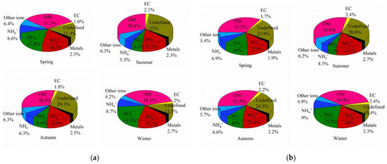 Percentage of each component in PM collected for four seasons: (a) PM2.5; (b) PM1.