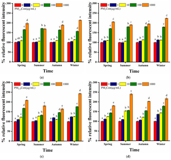 Effect of different seasons of PM exposure on nematode intestinal autofluorescence and ROS levels: (a) intestinal autofluorescence levels of nematodes exposed to 1, 10, 100 and 1000 µg/mL of PM2.5 in four seasons compared to the control; (b) intestinal autofluorescence levels of nematodes exposed to 1, 10, 100 and 1000 µg/mL of PM1 in four seasons compared to the control; (c) ROS levels of nematodes exposed to 1, 10, 100 and 1000 µg/mL of PM2.5 in four seasons compared to the control; (d) ROS levels of nematodes exposed to 1, 10, 100 and 1000 µg/mL of PM1 in four seasons compared to the control. L4 stage larvae were selected for 24 h acute exposure. Different letters (a, b, c, d, e) indicate significant differences among the five PM treatments in each season (p < 0.05). Bars represent means ± SEM.