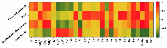 Heat map of correlation coefficients between body length/intestinal fluorescence/ROS/germ cell apoptosis and PM composition.