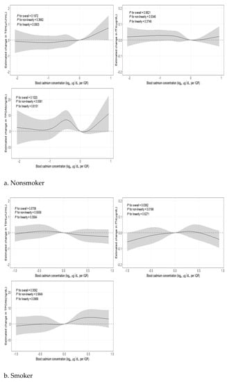 In addition, the restricted cubic splines (Figure 2) show the nonlinear association between BCd and thyroid hormones according to smoking status in the adjusted model. There were significant nonlinear associations between BCd concentrations and fT4 levels in a group of smokers. These nonlinear associations were not significant in other groups.