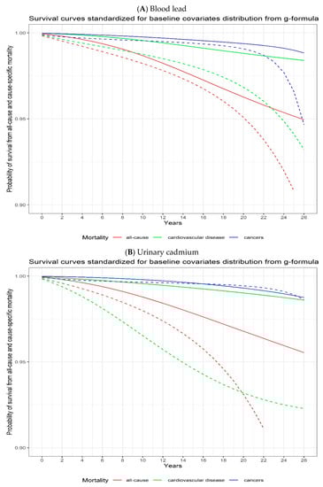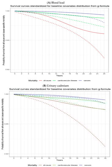 Laouali, N.; Benmarhnia, T.; Lanphear, B.P.; Oulhote, Y. Associations with Blood Lead and Urinary Cadmium Concentrations in Relation to Mortality in the US Population: A Causal Survival Analysis with G-Computation. Toxics 2023, 11, 133. https://doi.org/10.3390/toxics11020133