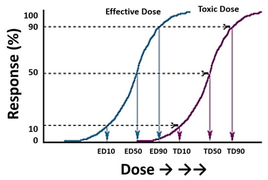 Typical sigmoid curves representing the dose of a drug and its response (measured as a percentage) in a group of individuals. The plot includes two curves relating to effective doses (left) and toxic doses (right). Extrapolation of the response gives the effective and toxic doses (ED and TD, respectively) for 10, 50, and 90% of the individuals exposed to these doses. Figure modified from the Toxicology Teaching Manual of the University of Las Palmas de Gran Canaria with the authors’ permission.