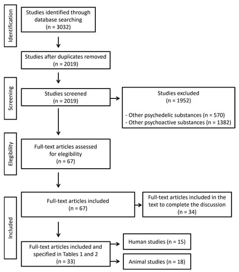Once the search was conducted, studies reporting toxic or lethal doses related to psychedelics were included. We identified 3032 manuscripts for inclusion. The initial quality assessment was made evaluating the title and the abstract. We excluded articles referred to other psychedelic and psychoactive substances. After a screening and evaluation of the whole text, a total of 67 manuscripts were eligible: 33 gave relevant information about effects associated to high doses of psychedelics and 34 were included in the text to complete the discussion. Articles reporting experimental data on lethal doses in animals were also included. Characteristics of eligible studies are summarized in Figure 2. The revision was made according to PRISMA 2020 guidelines. The search was conducted between 1 July and 31 July 2022.
