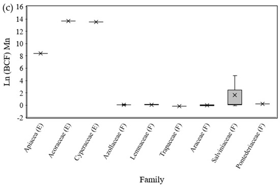 Boxplot of bioconcentration factors (BCF), expressed as ln, for iron (Fe) (a), copper (Cu) (b) and manganese (Mn) (c). The symbol “X” represents the mean. (E) Emergent families of macrophyte; (F) floating families of macrophyte; (S) submerged families of macrophyte.