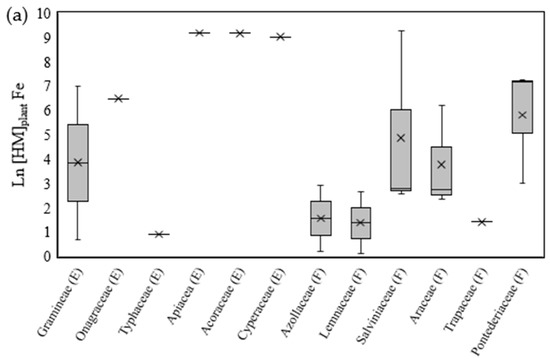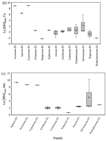 For the differences among families, there were concentrations below 1 only for copper (ln[HM]plant < 0) and mainly among the floating macrophytes (Figure 2b). Again, the highest ln[HM]plant values occurred for the families Acoraceae (Acorus gramineus), Cyperaceae (Cyperus alternifolius L.) and Apiaceae (Centella asiatica) in studies on the removal of these metals in wastewaters from the pulp and paper industry [51] or metallurgy [53] (Figure 2a–c).