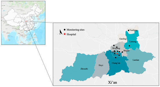 Air pollution data were collected at 13 environmental monitoring stations in Xi’an (Figure 2), established by the Xi’an Environmental Protection Administration. We took the average of the air pollution concentrations from the 13 monitoring stations as the final data. Air pollutants included (), (), (), (), CO (), and (). Daily 24 h concentrations were calculated by averaging air pollutant concentrations over 24 h per day for all five pollutants except , which was calculated as 8 h maximum values (from 10 a.m. to 6 p.m.). Missing data were imputed by linear interpolation. Daily meteorological data, including mean temperature (), minimum temperature (), maximum temperature (), and relative humidity (%), were collected from the Xi’an Meteorological Administration.