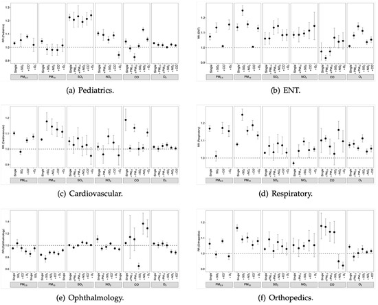 Relative risks of outpatient visits for medical departments with a 10-unit increase in air pollutant concentrations (cumulative lags from 0 to 3 days) in single- and two-pollutant models. (a)–(f): Relative risks of outpatient visits for pediatrics, ENT, cardiovascular, respiratory, ophthalmology, orthopedics, respectively.