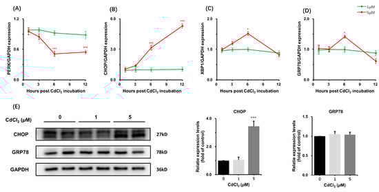 CdCl2 treatment induced the endoplasmic reticulum stress in the Sertoli cell. The mRNA levels of (A) PERK, (B) CHOP, (C) XBP1, and (D) GPR78 were measured by using qPCR at 1, 3, 6, and 12 h after treatment with CdCl2 (1, 5 μM). The protein levels of CHOP and GRP78 at 12 h were evaluated by immunoblotting (E). * p < 0.05 compared to the control group, *** p < 0.001 compared to the control group.