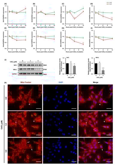 Cadmium was recently shown to interfere with the mitochondrial unfolded response (UPRmt), and it disrupted the homeostasis of mitochondrial dynamics in the kidney. In consistency with CdCl2-induced changes in the kidney, most genes related to UPRmt and mitochondrial dynamics were downregulated in 5 μM groups (Figure 3A–H). Among the genes, that the expression was reduced significantly, in Nrf1 and Mfn1. Additionally, the expression fold was reduced to 0.38 ± 0.02 (p < 0.01) and 0.36 ± 0.02 (p < 0.01), respectively. Immunoblotting also showed a concomitant decrease in Nrf1 and Mfn1 protein levels (Figure 3I). Moreover, CdCl2 treatment also led to changes in mitochondrial morphology. Tubular or filamentous mitochondria were regarded as normal whereas dotted mitochondria were deemed to be damaged. The treatment with CdCl2 induced a significant increase in dotted mitochondria compared with blank control (Figure 3J). These alternations suggested that a higher concentration of CdCl2 caused a disturbance in the homeostasis of mitochondrial activity.