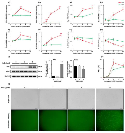 CdCl2 induced oxidative stress in TM4. The mRNA levels of Nrf2-related genes were measured using qPCR after treatment with CdCl2 for 1, 3, 6, and 12 h (A–H). The protein levels of HO1 and SOD2 at 12 h were measured by immunoblotting (I). ROS level induced by treatment with CdCl2 for 2 h was measured by a fluorescence probe (DCFH-DA). Representative images illustrate the presence of fluorescent DCF (K), an oxidation product of DCFH oxidized by ROS. The MDA levels were measured after treatment with CdCl2 for 1, 3, 6, and 12 h (J). * p< 0.05 compared to the control group, ** p < 0.01 compared to the control group, and *** p < 0.001 compared to the control group.