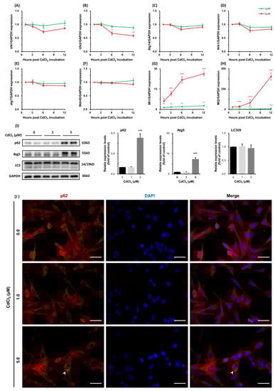 Autophagy is a lysosomal degradation pathway that regulates cellular homeostasis. To determine the effects of CdCl2 on autophagy, we measure the expression of a list of genes, which has been established as a gene toolbox for monitoring autophagy. These genes, including Atg14, Atg7, Nbr1, Ulk1, Ulk2, and Wdr45, showed suppression of transcription across the incubation period (Figure 5A–F). Furthermore, CdCl2 (5 μM) induced an increase in the protein levels of p62 and Atg5 at 12 h, without a significant alternation in the ratio of LC3I to LC3II (Figure 5I). The expression of p62 was also confirmed using cellular immunofluorescence. CdCl2 treatment increased the intensity of p62 fluorescence signals (bright red) in the cytoplasm (Figure 5J).