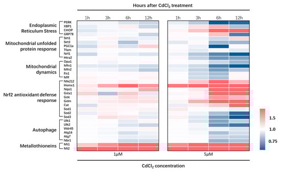 The overall transcriptional dynamics of genes involved in the cellular response to CdCl2 treatment are shown in Figure 6. And transcriptional change of Sod1, Mff, and Tram are listed in Figure S3.