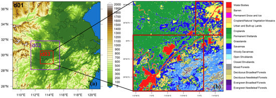 (a) Three nested domains d01, d02, and d03 (in different boxes) and topographical height above sea level (color contours, unit: m) for WRF-Chem simulation; (b) land use type in the domain d03. The big box in the lower left corner of d03 denotes the centralized big lakes (CBLs) Dongting Lake and Honghu Lake, and the small box in the upper right corner denotes the discrete small lakes (DSLs) around Wuhan.