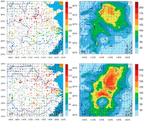 Spatial distribution of (left panel) observed and (right panel) simulated near-surface PM2.5 concentrations (color dots (left panel), color contours (right panel), μg/m3), and 10 m wind vectors (m·s−1) averaged (a,b) over 14–17 January and (c,d) over 19–22 January in 2018. Blue lines indicate sea level pressure (hPa). Blue area denotes the Pacific Ocean in the left panels.
