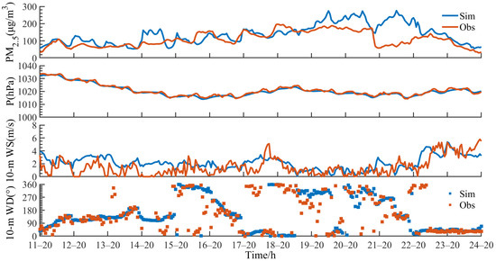 Comparison between simulation and observation of near-surface PM2.5 concentrations, surface air pressure (P), 10-m wind speed (10-m WS), and 10-m wind direction (10-m WD) in Wuhan from 20:00 11 January to 20:00 24 January 2018.