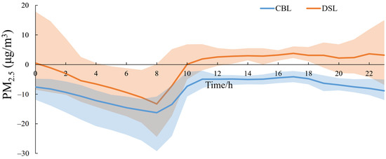 Figure 5 shows the diurnal variations of near-surface PM2.5 concentration differences between the simulations from the lake experiment and no-lake experiment averaged over CBLs and DSLs during the air pollution process. Figure S5 shows the PM2.5 concentrations in the lake experiment simulation. It is revealed that the influences of the “water network” on the PM2.5 exhibit obvious diurnal variations, which vary with the density and area of “water network”. Around sunrise, water bodies cause the greatest decreases in PM2.5 concentrations over both CBLs and DSLs. The CBLs reduced PM2.5 by an average of 16.28 μg/m3 at 08:00 (maximum 29.28 μg/m3), while the DSLs reduced PM2.5 by an average of 13.29 μg/m3 (maximum 24.42 μg/m3). More significantly, the CBLs reduced the PM2.5 concentrations all day, with the stronger potential to “purify” PM2.5 particles at night. The DSLs aggravated local PM2.5 pollution from 10:00 to 00:00, with the peak of 17.91 μg/m3 at 00:00 and decreasing PM2.5 concentrations in other periods. In general, CBLs can result in a decrease of the local PM2.5 concentrations by 4.15–16.28 μg/m3 (4.90–17.68%), while the underlying “water network” of DSLs has weak potential to clean the air environment, with the reverse impacts on PM2.5 levels ranging from −13.29–3.76 μg/m3 in the relative change rates from a negative value of −5.63% to a positive value of 1.56%.
